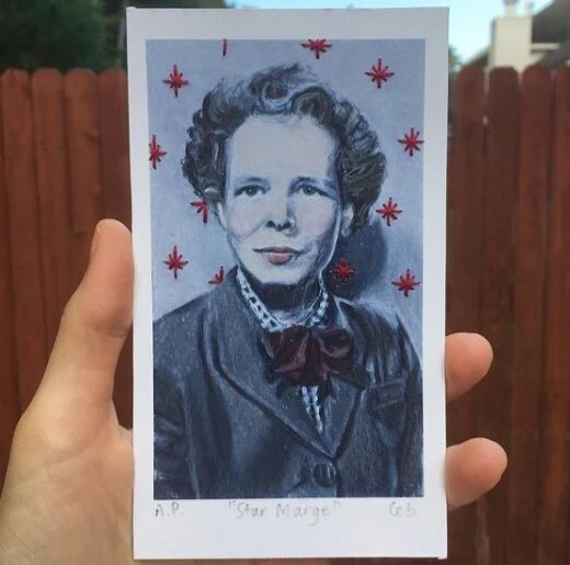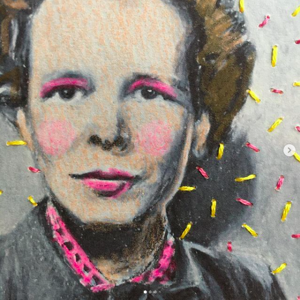 Prints of Carrie’s painting, Marge, embellished with embroidery
